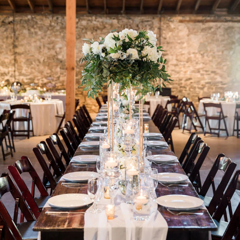 Our venue comes fully equipped with round tables, rustic farm tables, elegant mahogany chairs, and satellite bars, giving you everything you need for a seamless and stylish event setup.